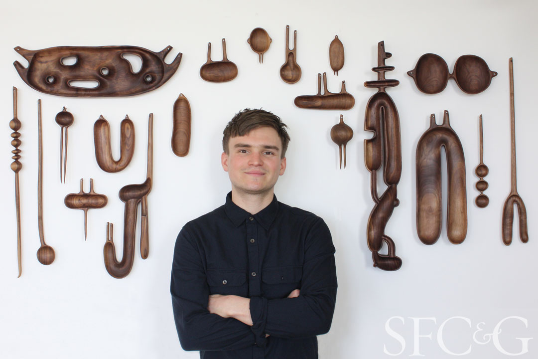 Watts’ work is strongly influenced by the traditions of bespoke furniture design. In 2012, after completing a B.A. in sculpture at the University of Oregon, he returned to the Bay Area and spent three years learning woodcraft from the ground up at Cottage Table Co. in Potrero Hill. “Even though I no longer create legitimately usable objects, everything I do is seen through the lens of my experience in fine furniture making,” says Watts. Taken with the raw character and resistance of wood, he began collecting scraps and cut-offs from the workshop and, like all novice woodcarvers, started his journey by whittling spoons. From the start, Watts’ self-described “freaky utensils” defied function with their fantastically elongated handles and organ-like shapes that playfully confused interior and external. “You’re supposed to just think about them instead of use them. I make spoons for your brain instead of your food,” he laughs.