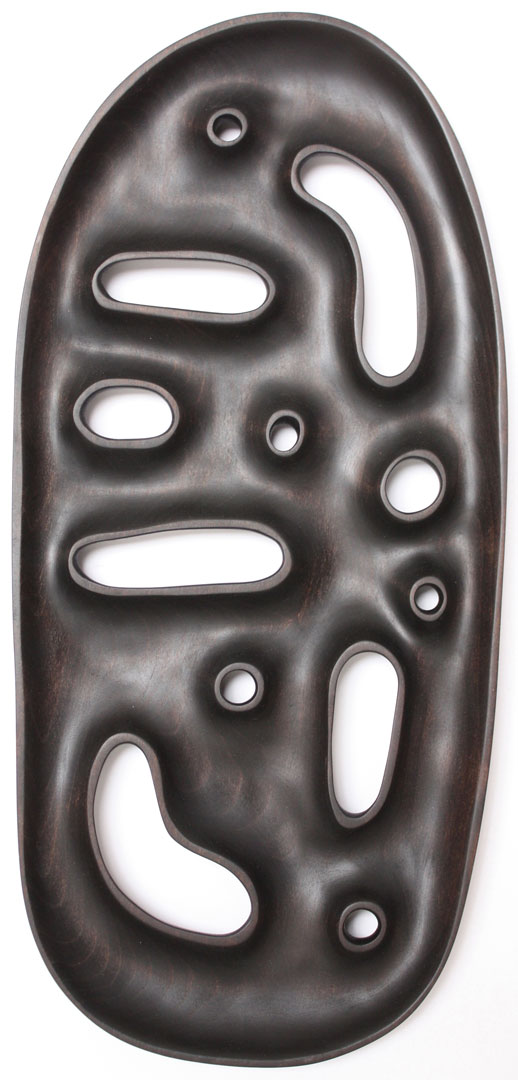 In his West Oakland studio—a modest space inside a larger industrial warehouse he shares with fellow woodworker David Ball—Watts begins each piece with a detailed sketch that he transfers directly to the wood. He draws inspiration from diverse sources: primordial forms from nature; Tantric meditative paintings; the Gutai artists of postwar Japan; and, especially, human anatomy books. “I love all the overlooked, not-as-beautiful parts of the body and try to work them into my shapes,” he muses. Using a mallet and other hand tools, he carves, figuring the depth as he goes. He then cuts out the basic contour with a band saw, continues to refine with hand-carving, selects a finish—sanded or rough, stained or natural—and hand-oils each piece. Of the process Watts notes, “There are unknowns,” as he inevitably discovers subtleties in grain that shift the work in new directions.