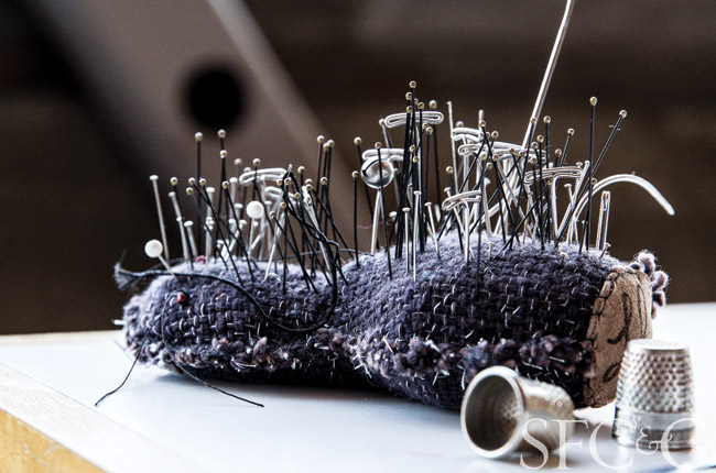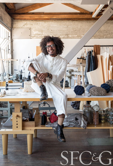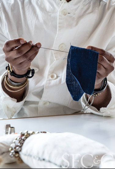 In addition to Dosa, he procures cloth from other artists and designers who work with natural fibers such as cotton, silk, leather, hemp, denim and linen. As the resident artist at Small Trade Company’s Mission District headquarters, Alexis has convenient access to the textile studio’s remnants.