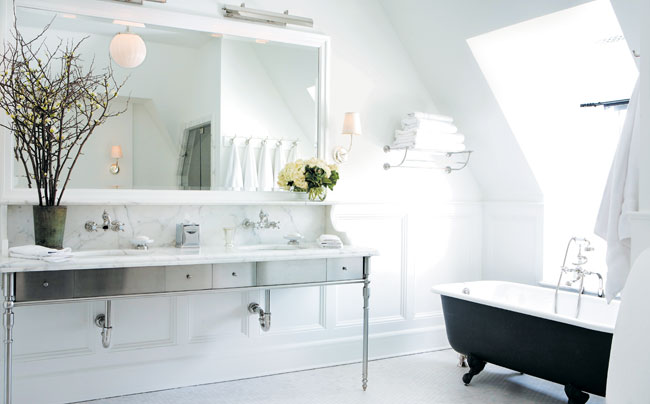 As part of a major renovation, Paulo Vicente of Vicente-Burin Architects transformed a cramped room with little natural light into a spacious, shimmering master bath. The homeowner wanted it to feel contemporary, but not conventionally “modern,” in keeping with the rest of the house. The main space houses a large shower and vanity. A water closet was tucked under attic stairs and a separate area was created to house a sculptural Waterworks tub. “It’s rare that you get to build a room just for a tub,” notes Vicente.