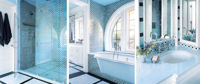 In a nod to her childhood in the Middle East (her father was in the diplomatic corps), the owner of this new home in Riverside chose a Moroccan theme for the master bathroom. “The homeowner is an artist who is adventuresome with colors,” says McKee Patterson, partner at Austin Patterson Disston Architects. “And she loves blues.”