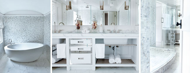 White painted woodwork in the vanity is accented by polished nickel, which is echoed in the towel bar shelves and the Visual Comfort sconces. The transparency of the shower door contributes to the openness of the room, while allowing the polished calacatta marble walls and floor to add a shimmering effect. “I really like the way the light comes in and bounces around,” says Vicente. The cove ceiling blends into the walls and reflects the masonry feel of the house, which has stone walls that inspired the curves in the design.