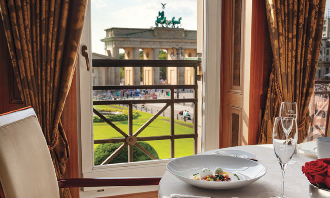 Old Berlin meets the modern-day metropolis at the Lorenz Adlon Esszimmer at Kempinski’s Hotel Adlon. Classic and contemporary haute cuisine are dramatically set against unobstructed views of the Brandenburg Gate. The wood-paneled library and private dining room has a replica of the original fireplace from the hotel lobby (which was destroyed in 1945), period antiques and a ceiling painting in the style of Giovanni Battista Tiepolo. Modern retro uniforms were designed by Patrick Hellmann, a Berlin fashion designer, who also creates limited editions of Lalique vases.