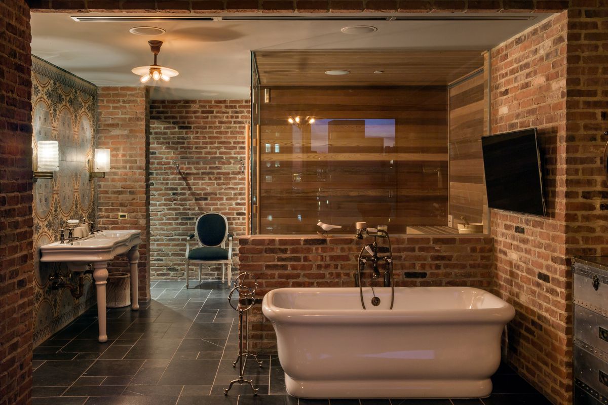 Those familiar with the Birkenstock brand will be surprised at the tailored style of this 2-bedroom spread (The New York Post declares “there’s nothing hippie-dippy about it”), but it is in fact full of classic treasures like a 1000 lb steel-and-brass safe from the Bank of France, reclaimed hardwood floors from the Portuguese embassy in Paris and hand-cut blue stone tiles from Belgium. A 50-foot wall of windows takes advantage of the views of the Statue of Liberty and One World Trade Center, while retractable glass garage doors in the living area allow for a flexible layout. The loft comes furnished, which means that the new owner will inherit the curated mix of pieces that decorate the 3,500 square feet including Napoleon III chairs, vintage French leather club chairs and various mid-century modern items. Daniel Hedaya and Khashy Eyn of Platinum Properties represent the listing.