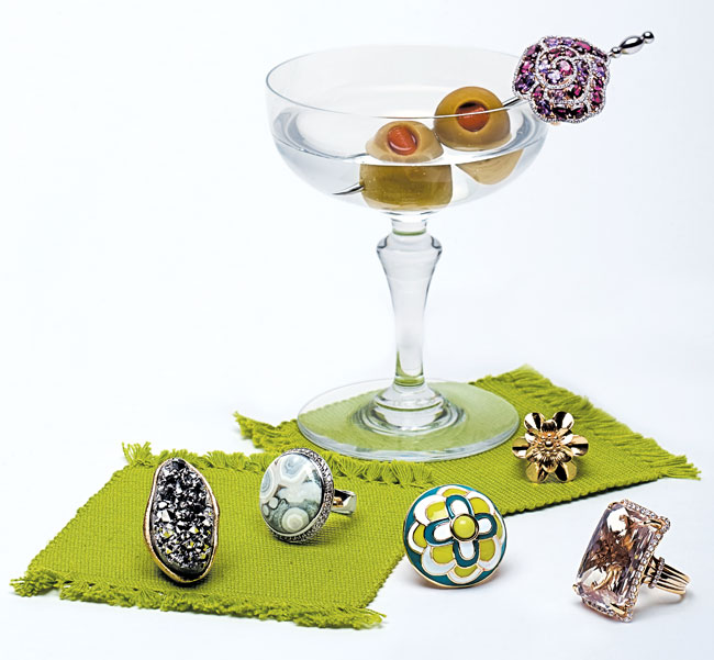 We’ll Drink To These (clockwise from top) Casato amethyst ring, $5,600, at Rose Jewelers, 57 Main St., Southampton, 631-283-5757, rosejewelersny.com. Gold flower ring, $28, at C. Wonder, 5 Main St., Southampton, 631-287-2645, cwonder.com. Rose quartz ring with pavé diamonds set in 18k gold, $10,000, at Michelle Farmer Collaborate, 2491 Montauk Hwy., Bridgehampton, 631-604-1850, michellefarmer.com. Trina Turk gold vermeil and enamel ring, $45, at Banana Republic, Bridgehampton Commons, Montauk Hwy, Bridgehampton, 631-537-5534, bananarepublic.gap.com. Ocean jasper cabochon ring with brown diamond pavé set in 18k gold, $7,350, at Tamara Comolli, 27 Main St., Southampton, 631-283-7600, tamaracomolliusa.com. Titanium and druzy chunky ring, $250, at Jennifer Miller, 28c Jobs Ln., Southampton, 631-283-9061, jennifermillerjewelry.com.