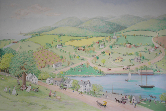 The design features an imaginary landscape with activities along the river — rowing outings, horse and buggy rides and games of snap the whip on village greens. Such state landmarks as the Old Saybrook lighthouse, Cornwall’s covered bridge and Greenwich’s Bush-Holley House are also painted in.