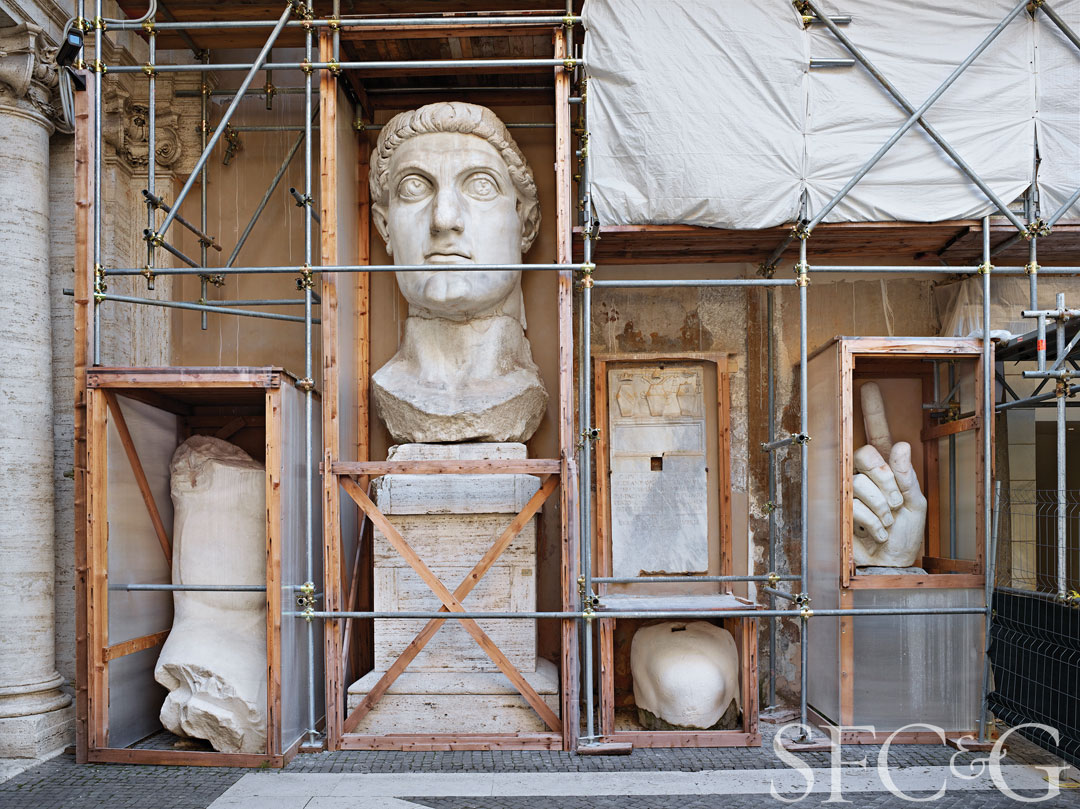 She also photographed the outsized fragments of Musei Capitolini’s Colossus of Constantine, which, isolated in protective scaffolding during restoration, evoked a heightened sense of the fragmented historical narratives they hold. “Officials didn’t want me seeing the piece that way and kept urging me to come back when it was finished,” says Wagner, who told them she wouldn’t care at that point.