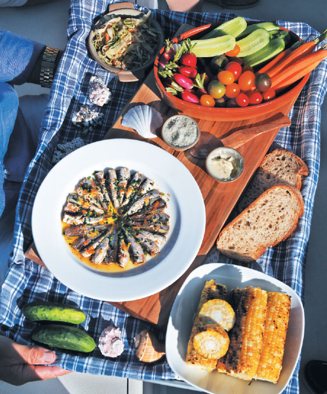 SEAWORTHY SPREAD Spring crudités with gray sea salt, fresh coleslaw, Artisan bread, marinated sardines and grilled corn on the cob. Raw veggies are served on a wooden board from Bungalow.Slices of rye and wheat germ bread, made exclusively for Artisan by the SoNo Baking Company & Café, are paired with sweet butter. Corn is boiled in salt water, shucked and grilled to perfection.