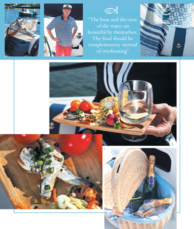 (top, left to right) Pack light with a recycled linen, French drawstring bag from Bungalow. Jim Sawyer welcomes guests. A nautical throw and decorative blue and white pillows from Lillian August give the boat an ultra-comfortable feel.