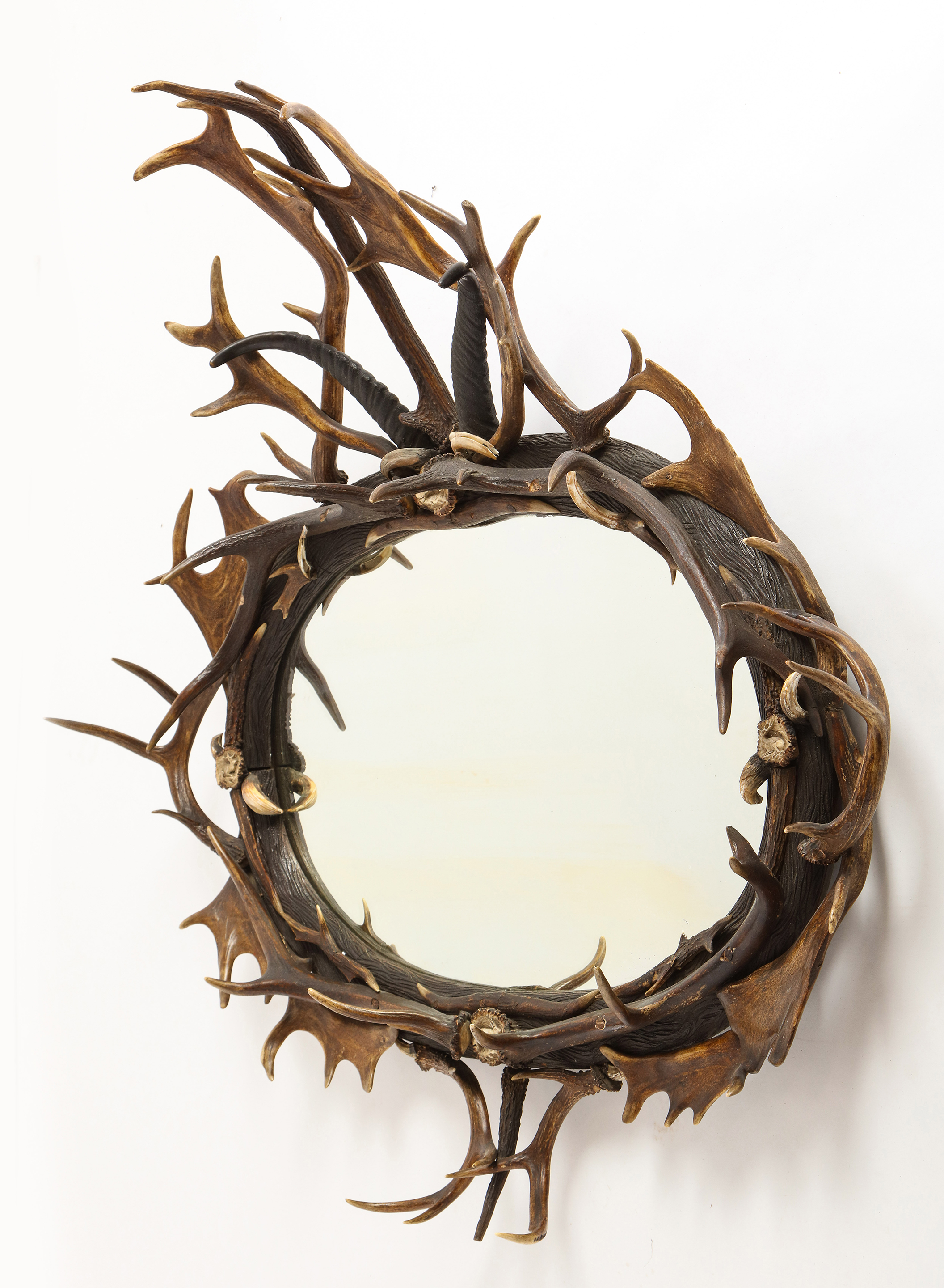 Swiss ‘Black Forest’ Antler and Boar Tusk-Mounted Mirror, Early 20th Century During the Victorian Era, the popularity of depictions of wildlife in interior design grew rapidly and became highly sought after in affluent homes. The Swiss ‘Black Forest’ antler and boar tusk-mounted mirror encapsulates the wildlife theme with a symmetrical design of Roe buck antlers with interspersed boar tusks around the carved linden wood frame. $3,800, 1stdibs.com.