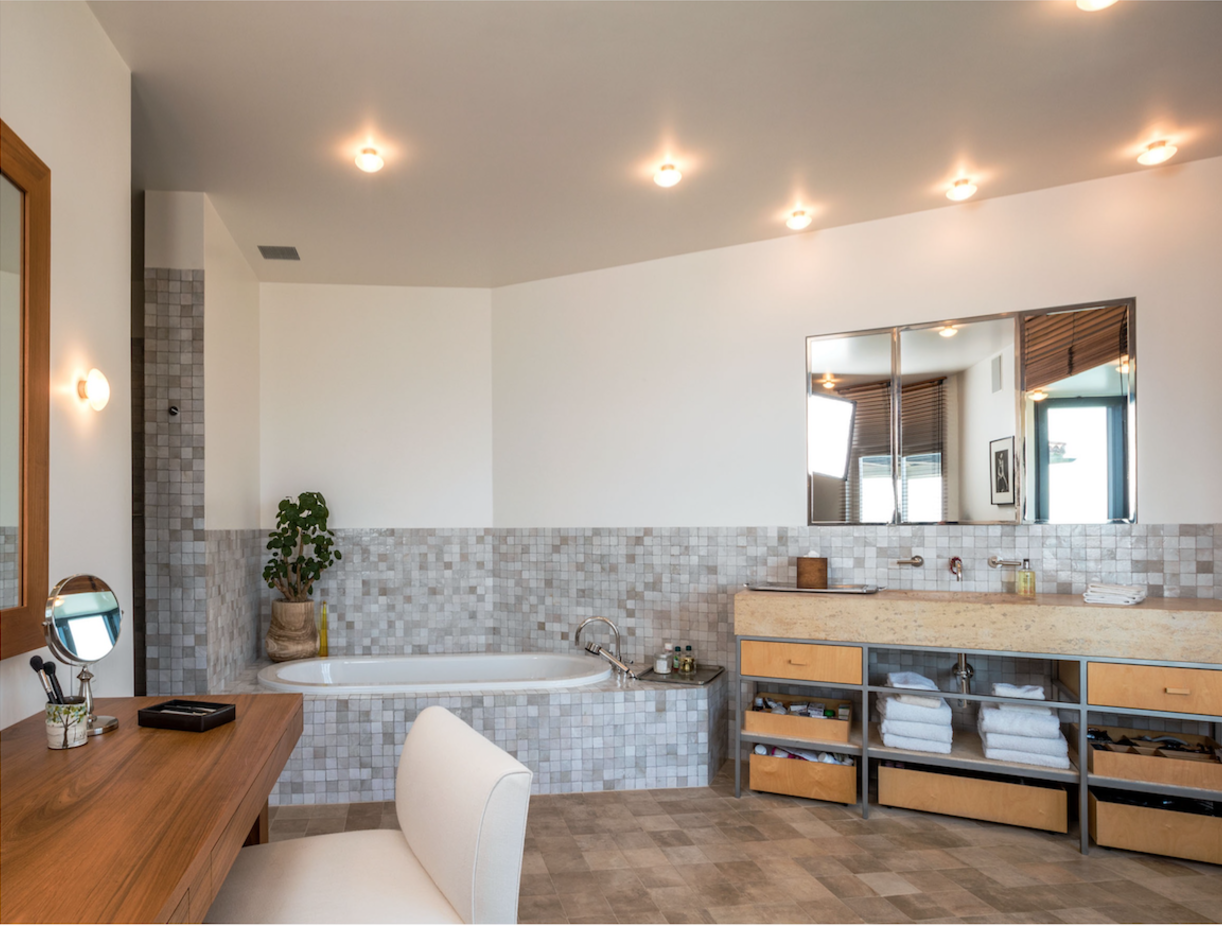 The house has undergone a five-star celebrity transformation and boasts 5,254 square feet of living space, 4 bedrooms and 5 bathrooms located on 3 acres of park-like beachside grounds. Inside, it’s bright and airy with floor-to-ceiling sliding glass doors providing a panoramic view of the ocean and access to the wraparound deck from the first floor great room. The first level also houses a sitting area, dining area, gourmet kitchen and breakfast bar. Upstairs, there are three bedroom suites along with a media room that could be configured as a fourth bedroom. The master suite features two en-suite bathrooms, a fireplace and a dressing room and one of the other bedrooms has its own island kitchen.