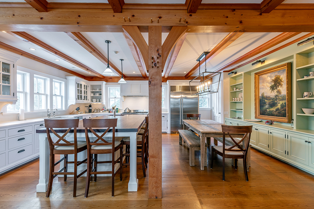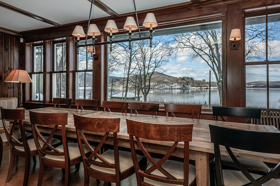 Sited along the shores of Lake Waramaug, the heart of the 10-acre compound is the newly renovated Adirondack-style inn, offering eight bedrooms, a sprawling covered porch, and a stone terrace, all with views over the water. You can tell that in its renovation, the kitchen was given special care and attention as it looks fresh and contemporary while feeling cozy and rustic, too.