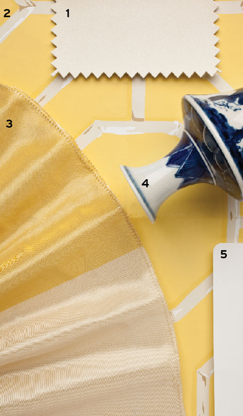 1 Chair fabric, Brina in alabaster, Kravet (T), 800-645-9068, kravet.com. 2 Walls and ceiling wallcovering, Bamboo in ivory and yellow, Cowtan & Tout (T), cowtanandtout.com. 3 Curtain fabric, Bellini Stripe in yellow and ivory, Cowtan & Tout. 4 Blue and white porcelain on table, Sandra Morgan Interiors. 5 Trim paint, Scullery White, Chistopher Peacock Paint, peacockpaint.com.