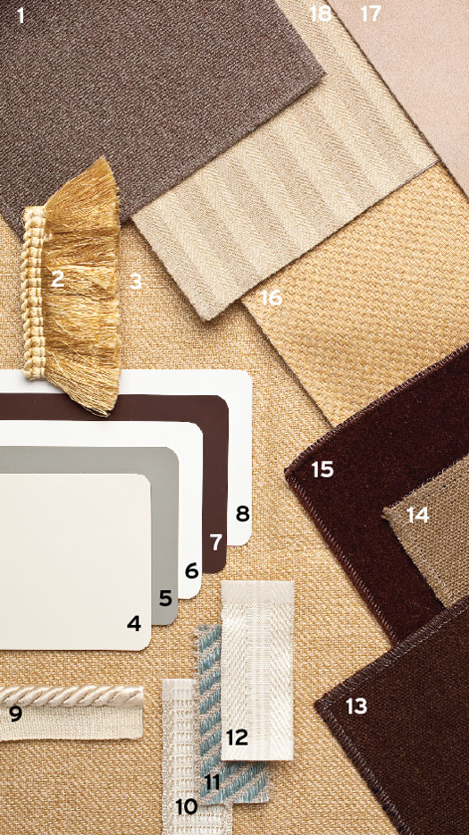 1 Loveseat fabric, Sark in tern. 2 Throw pillow trim, P.1106.04. 3 Drapery fabric, Twill in lynx. 4-8 Christopher Peacock paint: Mayfair White, Abbey Walls, Scullery White, Bitumen and Porcelain, peacockpaint.com. 9 Throw pillow cord trim, P.1108.01. 10 Skirt on console trim, P.1105.01. 11 Trim on throw pillows, P.0166.03. 12 Loveseat trim, P.1101.01. 13 Table skirt fabric, Ruff in chocolate. 14 Double welt on ottoman, Aripeka in mussel. 15 Chair fabric, Wool Velvet in hazelnut. 16 Leading edge on drapery fabric, Caryopsis in spelt. 17 Ottoman fabric, Picardie in pug. 18 Wing chair fabric, Crail in ceramic. All fabric and trim from Rogers & Goffigon Ltd. (T),