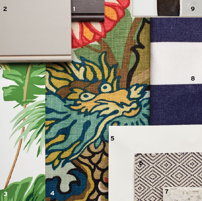 1 Cabinetry, maple in onyx, Medallion through NuKitchens, nukitchens.com. 2 Cabinetry, maple in Harbor Mist, Medallion through Nukitchens. 3 Wall covering on ceiling, Negril, Thibaut (T), thibautdesign.com. 4 Valance, artwork fabric, Chiang Mai Dragon in aquamarine, Schumacher (T), 212-415-3900, fschumacher.com. 5 Wall paint, White Dove, Benjamin Moore through Ring’s End, ringsend.com. 6 Cushion fabric, Breaker in navy, DeLany & Long Ltd. through Rogers & Goffigon Ltd. (T), 203-532-0010. 7 Countertops, Martini Flint, Vetrazzo, Artistic Tile, artistictile.com. 8 Changing cabana fabric, Seaward Captain in navy, Sailrite, sailrite.com. 9 Backsplash, East Hampton, Artistic Tile.