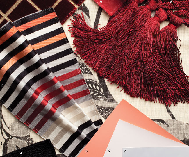 4 Drape trim, Le Jardin Silk Border in 17 black, Samuel & Sons (T), 212-704-8000, samuelandsons.com. 5 Crown stripe paint, Summer Sun Pink, Benjamin Moore through Ring’s End, ringsend.com. 6 Ceiling paint, Soft Pink, Benjamin Moore through Ring’s End. 7 Wall paint, Sidewalk Gray, Benjamin Moore through Ring’s End. 8 Table skirt trim, Rouen Tassel Fringe in 09 ruby, Samuel & Sons. 9 Drape border fabric, Raindrops in ripe tomato, Jamie Drake Collection, Schumacher.