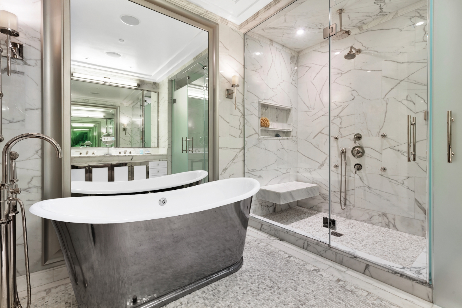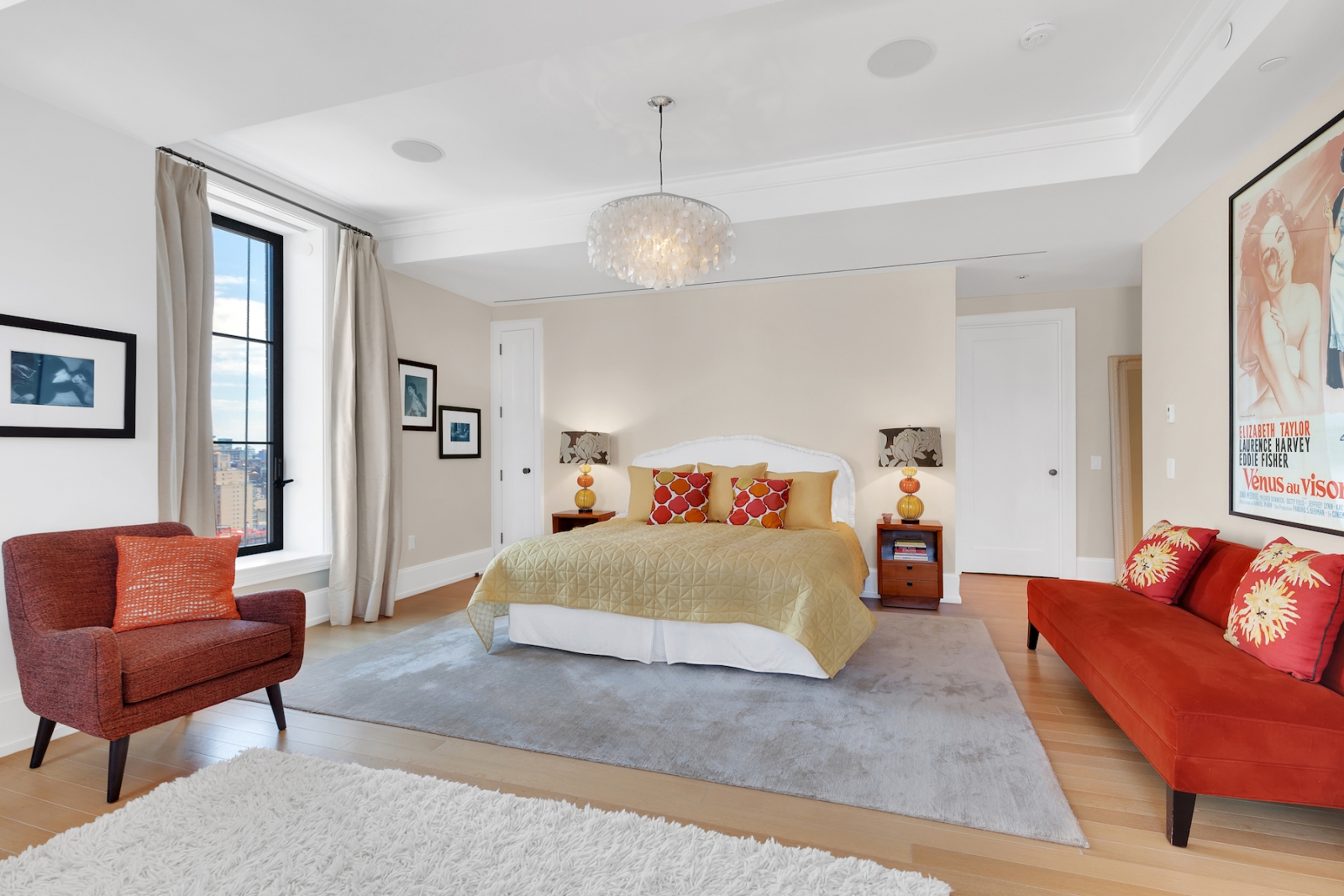 For anyone looking to take up residence in a 2-bedroom, 2.5-bath, 2,150-square-foot condo, Mercier’s former home offers a polished setting. Floor-to-ceiling windows anchor the chic living room, which is lined with French herringbone floors.