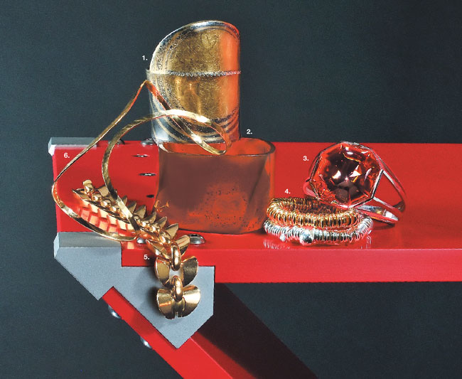 1. Silver, 18K yellow gold and pavé diamond cuff by Michael Zobel. $5,800, Simon Teakle, 4 Grigg St., Greenwich, 203-769-5888, simonteakle.com. 2. Agate Torque cuff by Frank Gehry for Tiffany & Co. $2,150, 140 Greenwich Ave., 203-661-7847, and 40 Post Road East, Westport, 203-221-7676, tiffany.com. 3. Baccarat’s mirrored pink crystal and rhodium plated sterling silver L’illustre cuff. $750, Baccarat, 238 Greenwich Ave., Greenwich, 203-618-0900, baccarat.com. 4. Sweetie bracelets in 18K yellow gold and sterling silver by Links of London. $1,700 and $225, David Harvey Jewelers, 995 Post Rd., Darien, 203-655-6400, 51 Wall St., Norwalk, 203-838-0627, davidharvey.com. 5. 18K yellow-gold French link bracelet circa 1940. $9,500, Donna Vock Designs, 608 Fifth Ave., New York City, 212-980-4249, donnavockdesigns.com. 6. 18K yellow-gold bracelet by Oscar Niemeyer for H. Stern Jewelers. $5,200, Mitchells, 670 Post Road East, Westport, 203-227-5165, Richards, 359 Greenwich Ave., Greenwich, 203-622-0551, mitchellstores.com. Zig Zag Redux chair by Peter Harrison in maple with a red lacquer finish. 518-882-4031, peterharrison.com.