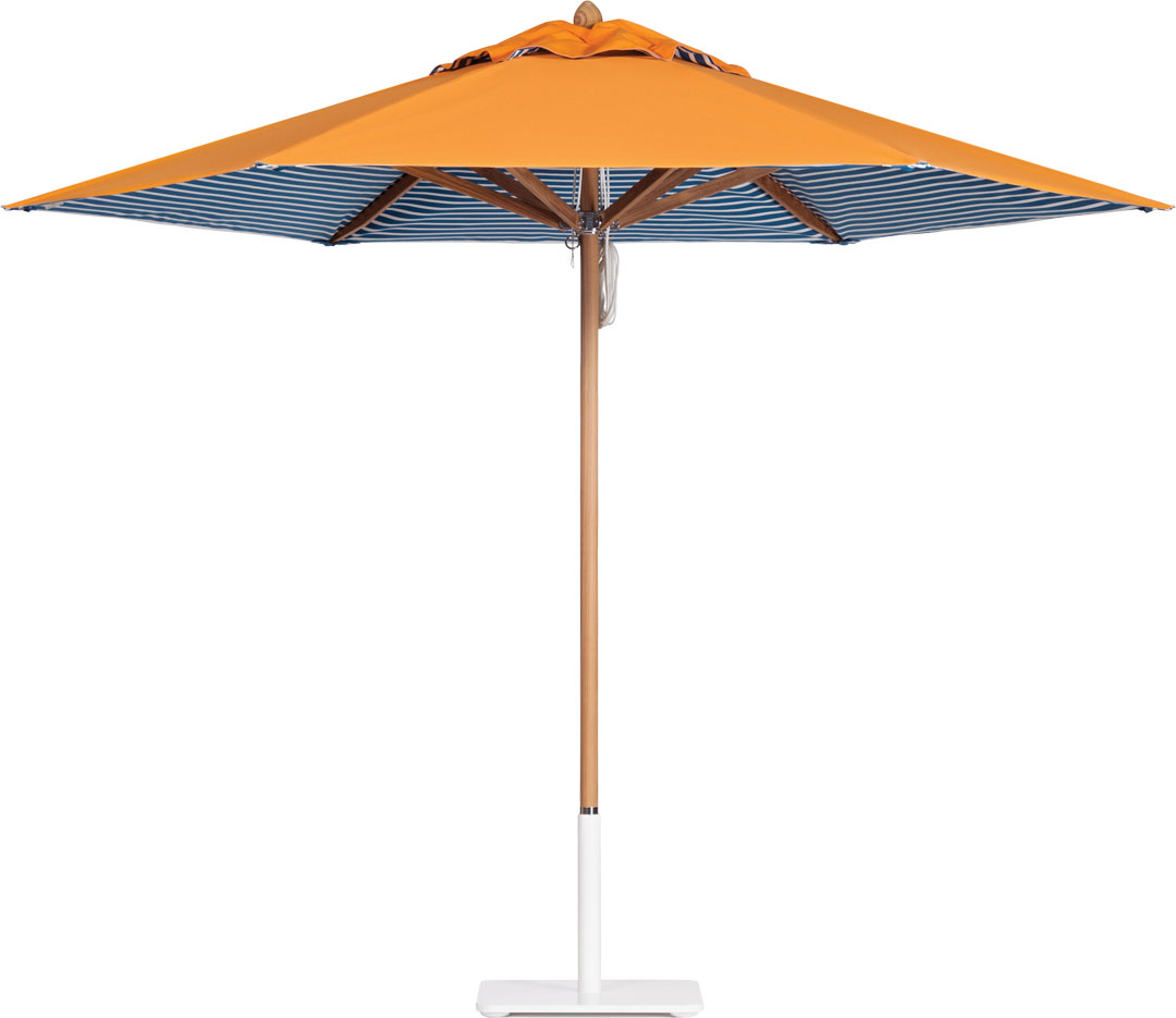Santa Barbara Umbrella pairs stately solids with sassy stripes for spring. This shapely Riviera® 10.5’ hexagon umbrella is shown with a Tango Orange outer canopy lined with Shore Regatta on a solid teak frame. Available in more than 100 color combinations, so color coordinate your outdoor space this spring.