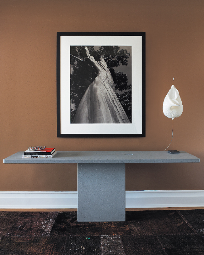 Artful Arrangements | The Golran rug in the entryway is from Poliform; the Gaku table lamp on the concrete slab console table is from Ingo Maurer.