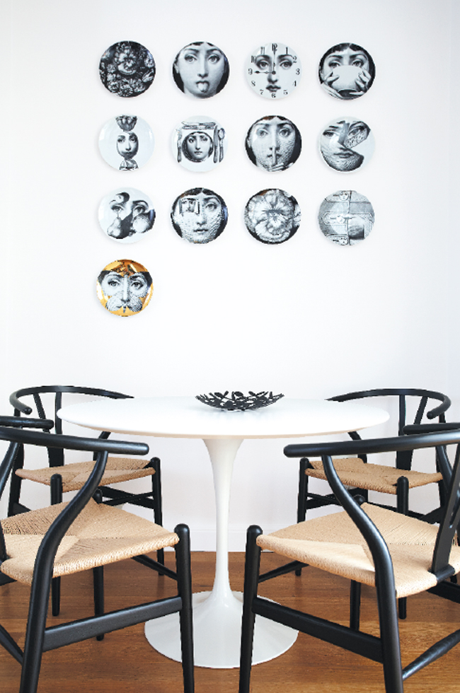 Artful Arrangements | In the kitchen, under the watchful eye of a set of Fornasetti plates, a suite of Wishbone chairs from Room & Board surrounds a Saarinen table from Design Within Reach.
