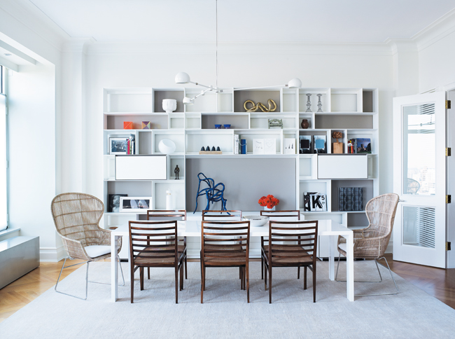 Appetizing View | Six Ripas chairs from Espasso and two wicker and stainless steel Crinoline armchairs from B&B Italia surround the dining table. Blue Pair, another Marcia Grostein sculpture, makes a statement on the Flat C wall unit, also from B&B Italia. The David Weeks Oseo light fixture is from Spring3d.