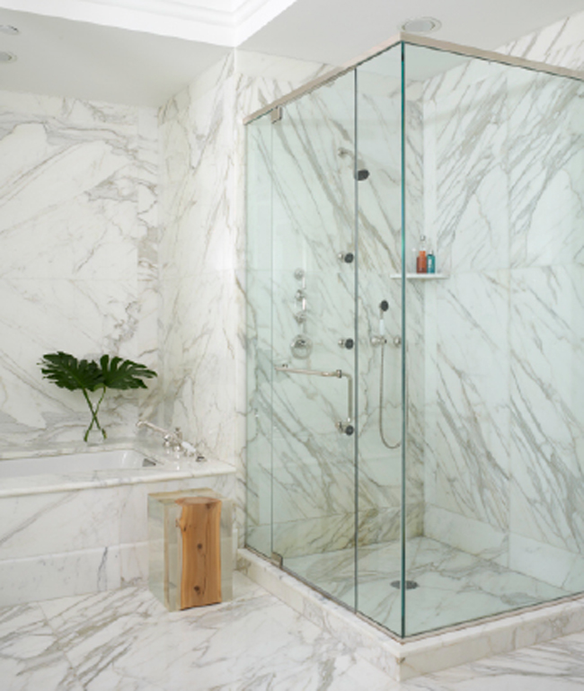 Bedroom Bliss | In the master suite, B&B Italia’s Karlos swivel chair sits next to a silver Martini side table from West Elm; the wood and resin stool in the all-marble bath is by Bleu Nature.