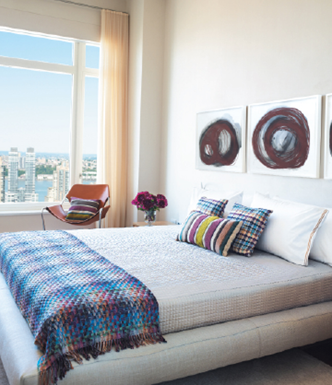 Bedroom Bliss | In a guest room, a trio of moody circles by Thomas Contegiacomo hangs above the Charles bed from B&B Italia. The circa-1930s leather and chrome McKay Craft sling chair is from Aero. All throws and pillows are from Missoni.