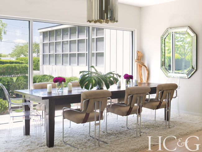An oak refectory table from Mecox is the centerpiece of the dining room, along with a suite of vintage chairs from R. E. Steele Antiques and a pair of Kartell Ghost chairs.