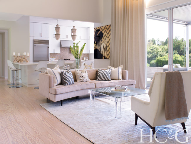 A Lucite coffee table, sofa, and armchair from Homenature form an inviting seating area in the living room.