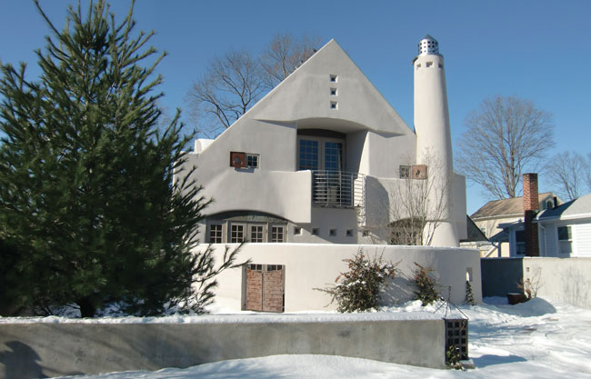 “I love this house,” says Roger Bartels of Bartels-Pagliaro Architects, about the Rowayton home he built for himself in 2006. “It’s quiet, it’s solid, it’s private and it’s filled with light…I just wish we could take it with us.” Although the architect’s inspiration was a 19th-century English cottage, his more obvious influence is the Desert Southwest. The 2,600-square-foot dwelling (which was featured in “Off the Grid” in CTC&G, May 2008) is constructed of stucco with a slate roof and features vaulted ceilings and artisan-made fixtures and finishes. And it is decidedly “not a slick, finished mansion,” Bartels adds. The home’s centerpiece is a great room—with a dramatic hearth and beamed ceilings—framed on one side by the translucent enclosure for the staircase (an extra-cool feature here is the matching steel-and-Plexiglas hatch that can be lowered to close off the second floor, fostering both privacy and energy efficiency). Another nice surprise: a den that’s housed in what Bartels calls the “clock tower.” Capping the soaring, circular ceiling of the space are the outlines of a clock, studded with marbles to mark the minutes. The room also features a firescreen for the fireplace and a pocket door, both designed by the architect. The home offers three bedrooms and three bathrooms, plus lots of windowed doorways that open onto a lovely terrace with a two-person pool/spa. Elaine Falkenberg of William Raveis Exceptional Properties in Rowayton has the listing. (917) 941-5362.