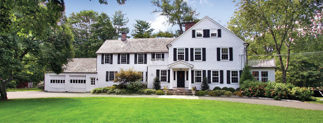 called the Stephen B. Wakeman House, was built in 1834 for one of the town’s founding families. We always love a portico and the 4,200-square-foot Colonial greets guests with one—as a segue to an old-fashioned “keeping room” warmed by a fireplace. The state-of-the-art kitchen features an adjoining butler’s pantry, desk alcove and breakfast room, which flow into the family room with coffered ceilings and a stone fireplace. The master suite is also thoroughly modern in its amenities with his-and-hers walk-in closets and a master bath with an oversized soaking tub. In all, there are five bedrooms, four bathrooms, plus one half bathroom. It’s listed with Sue Lieberman of the Riverside Realty Group in Westport. (203) 221-9876.