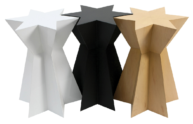 Inspired by the intricate shapes and rich culture of her native country, designer Nada Debs has created the 21.7″-high Nijma (Lebanese for “star”) occasional table, available in American walnut, maple, or lacquer. $2,300 to $2,550 each, at Mondo Collection, 20 W. 22nd St., Suite 1501, NYC, 212-675-8155, mondocollection.com.