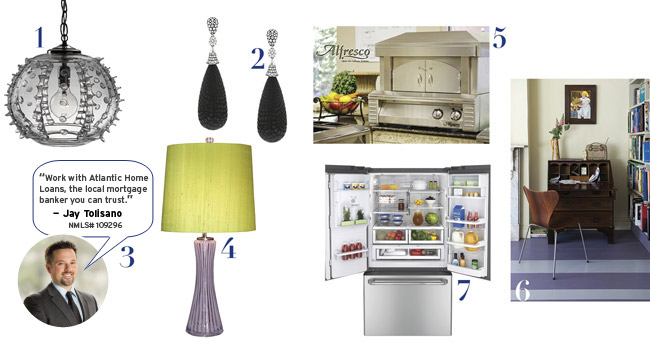 1. JULISKA The dazzle is in the details of this statement piece that delivers dramatic impact to any interior. Utilizing techniques passed down from generation to generation, skilled artisans have mouth-blown this exquisite glass pendant light. Each Juliska pendant comes with 6′ of chrome chain and uses one 120-watt bulb. (12″W x 10″T). $750. Juliska Flagship Store I 203.316.9118 I juliska.com. 2. DONNA VOCK DESIGNS “Libby” diamond and textured ebony wood earrings in 18K white gold and sterling silver, from the Fall 2013 collection. Donna Vock Designs I 646.599.0109 I DonnaVockDesigns.com. 3. THE JAY TOLISANO TEAM AT ATLANTIC HOME LOANS As regional mortgage bankers, we are focused on providing our customers with the best available service and mortgage solutions. We are empowered to approve and close your loan, all locally, with our in-house underwriter on staff. Whether you are applying for your own home or referring a client, friends or family member, you can rely on my team at Atlantic Home Loans. NMLS # 15241. The Jay Tolisano Team at Atlantic Home Loans I 203.913.4832 I jaytolisano.com. 4. JUST SHADES Nothing compliments this sleek handblown Italian glass lamp ($3,000), like this gorgeous Dupioni lime green oval shade ($155.00), both available at Just Shades in Greenwich. Just Shades I 203.681.2757 I justshadesny.com. 5. AITORO APPLIANCE Alfresco’s sexy new outdoor Pizza Plus Oven reaches 875 degrees in 15 minutes • ready to cook Neapolitan pizzas to perfection in 3 minutes. $5,999. Aitoro Appliance I 203.847.2471 I aitoro.com. 6. FARROW & BALL Be creative with Farrow & Ball floor paint! Available in 132 colours it’s suitable for interior wood and concrete floors. Visit our Greenwich showroom (32 East Putnam Avenue) for color inspiration. Featuring Brassica and Dove Tale floor paint. Farrow & Ball I 203.422.0990 I farrow-ball.com. 7. AITORO APPLIANCE From a cup of tea to a quick soup, our hot water dispenser on the GE Café ™ Series French Door Refrigerator makes on-the-go food and drink preparation a snap. $3,099. Aitoro Appliance I 203.847.2471 I aitoro.com.