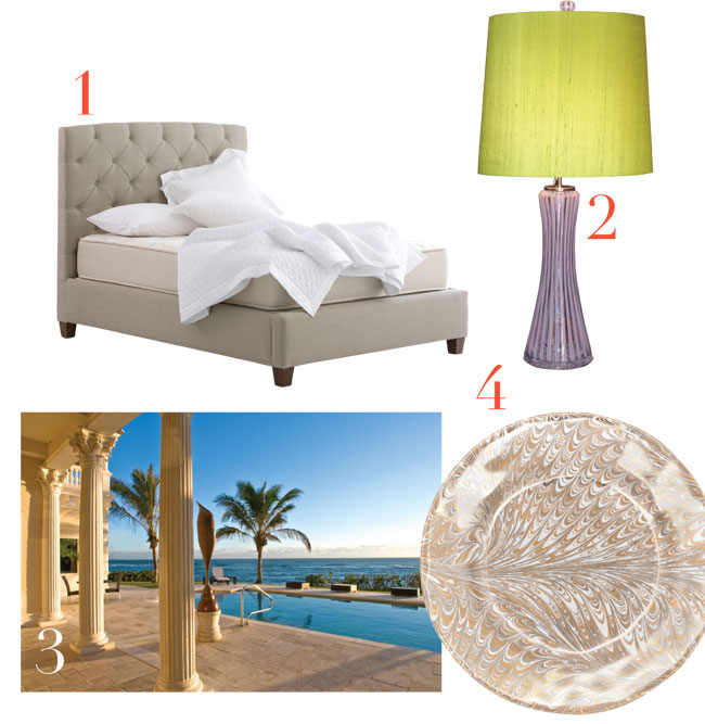 1. Fig Linens Part of the Matouk Upholstered Bed collection, the Sarah has a pared-down silhouette featuring a modern update on classic tufting. All beds pair seamlessly with linens available at Fig Linens | 203.227.8669 | figlinens.com. 2. Just shades Nothing compliments this sleek handblown Italian glass lamp designed by Carolyn Cartwright, like this gorgeous Dupioni lime green oval shade, both available at Just Shades. Just Shades | 203.681.2757 | justshadesny.com. 3. Sailfish Point Explore the oceanfront lifestyle of Sailfish Point, a private residential club offering Nicklaus Signature Golf, Spa/Fitness Complex, and Private Yacht Club and Marina. Sailfish Point | 800.799.7772 | SailfishPoint.com. 4. JuLiska Firenze ‘Medici’ Cocktail Plates – This set of four cocktail plates will become an essential part of your entertaining cache and makes a stunning hostess gift. The swirling palette of real gold and platinum tones offers a festive backdrop for small bites – from fresh figs and prosciutto to rustic breads and cheeses. $148. Juliska Flagship Store | 203.316.9118 | juliska.com.