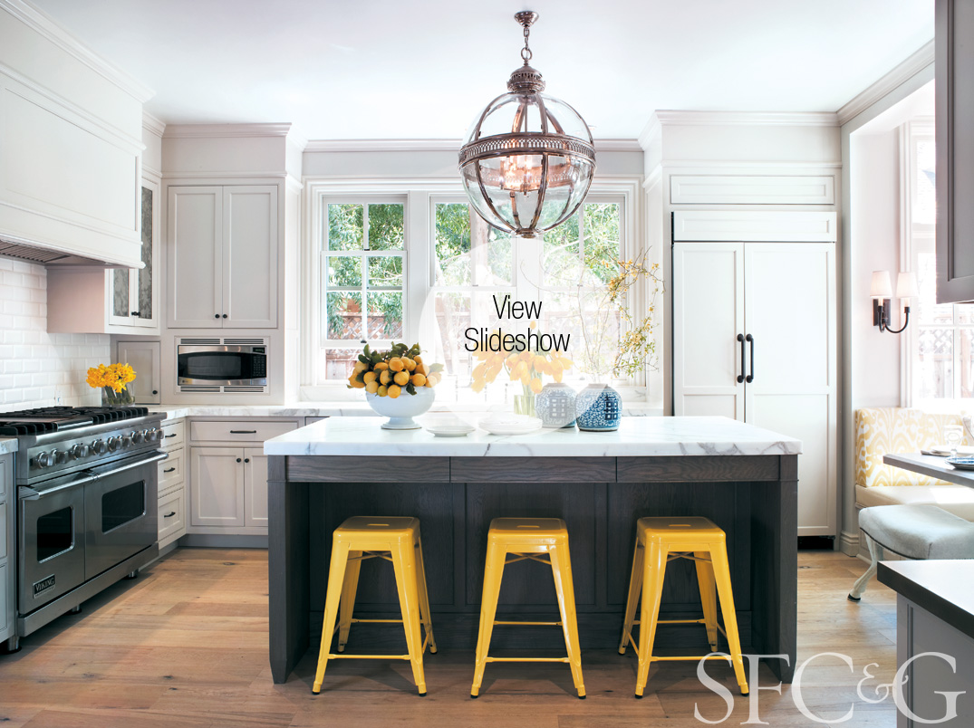 Relaxed elegance is a Dhong signature, and it’s an approach he doesn’t abandon in the kitchen. The sleek gray cabinetry and marble countertops give it understated luxe, while the bright-yellow Marais barstools and lemony ikat fabric in the sunny breakfast nook add youthful pops of energy.