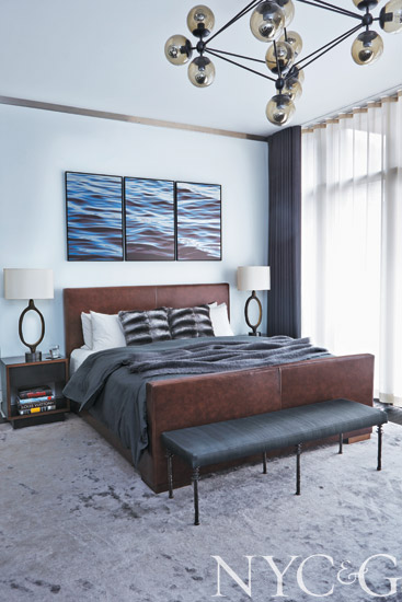 In the master bedroom, a Modo chandelier from Roll & Hill hangs above a McNally-designed bed frame. The night-table lamps are from Room and the bench is by Bourgeois Bohème Atelier.