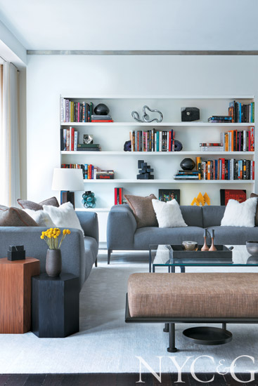 McNally-designed bookshelves act as a backdrop to the living room’s Metropolitan sofas from Poliform, upholstered in Holland & Sherry’s wool Bespoke Twill. The Shawn Henderson Mercury daybed is covered in Lee Jofa’s Malva in Mole.