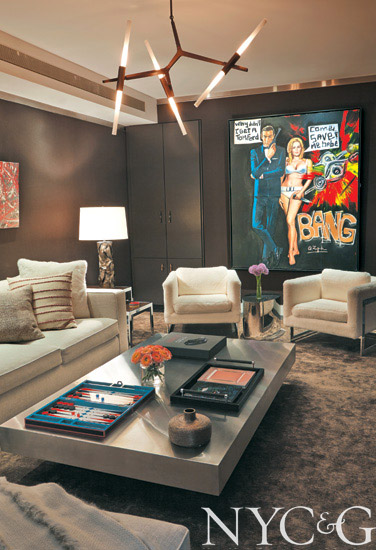 The media room features a Willy Rizzo steel coffee table, a Lindsey Adelman Agnes chandelier in bronze, and circa-1970 armchairs by Milo Baughman.