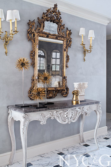 A master of serene, tailored interiors and richly muted palettes, Epstein employed soft grays accented with black, along with pops of metallic golds and silvers for the lighting and accessories. Venetian plaster walls, stone floors with hand-chiseled edges, custom-designed rugs, and vintage wooden herringbone floors lend the not-so-old apartment a timeless European elegance. In the gallery, French gessoed consoles, Italian gilt mirrors, and gilded French sconces add a note of drama, while giving new meaning to the idea of making a grand entrance.