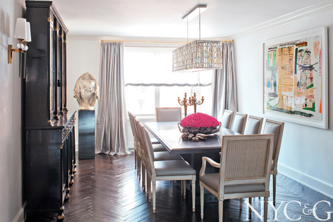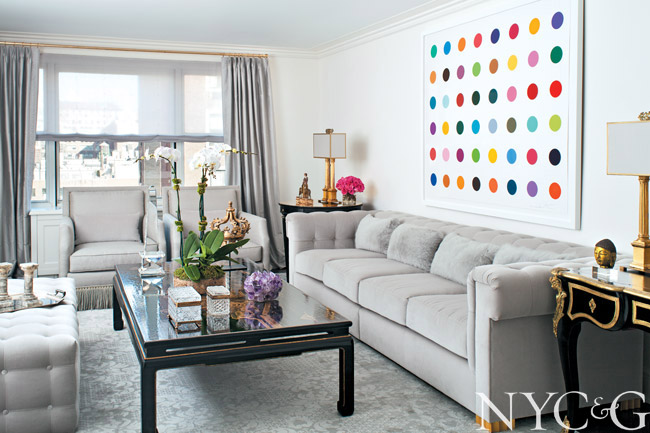 The decorating scheme is a study in contrasts, made more impactful by the addition of contemporary works by such artists as Damien Hirst and Jean-Michel Basquiat. Somehow, Hirst’s trademark colored dots seem just right among the living room’s fur accent pillows and an ebonized Louis XV bronze-doré desk. “I also used couture touches, like embroidering small pearls on the roman shades in the master bedroom as well as adding pencil pleating to the hems,” Epstein remarks.