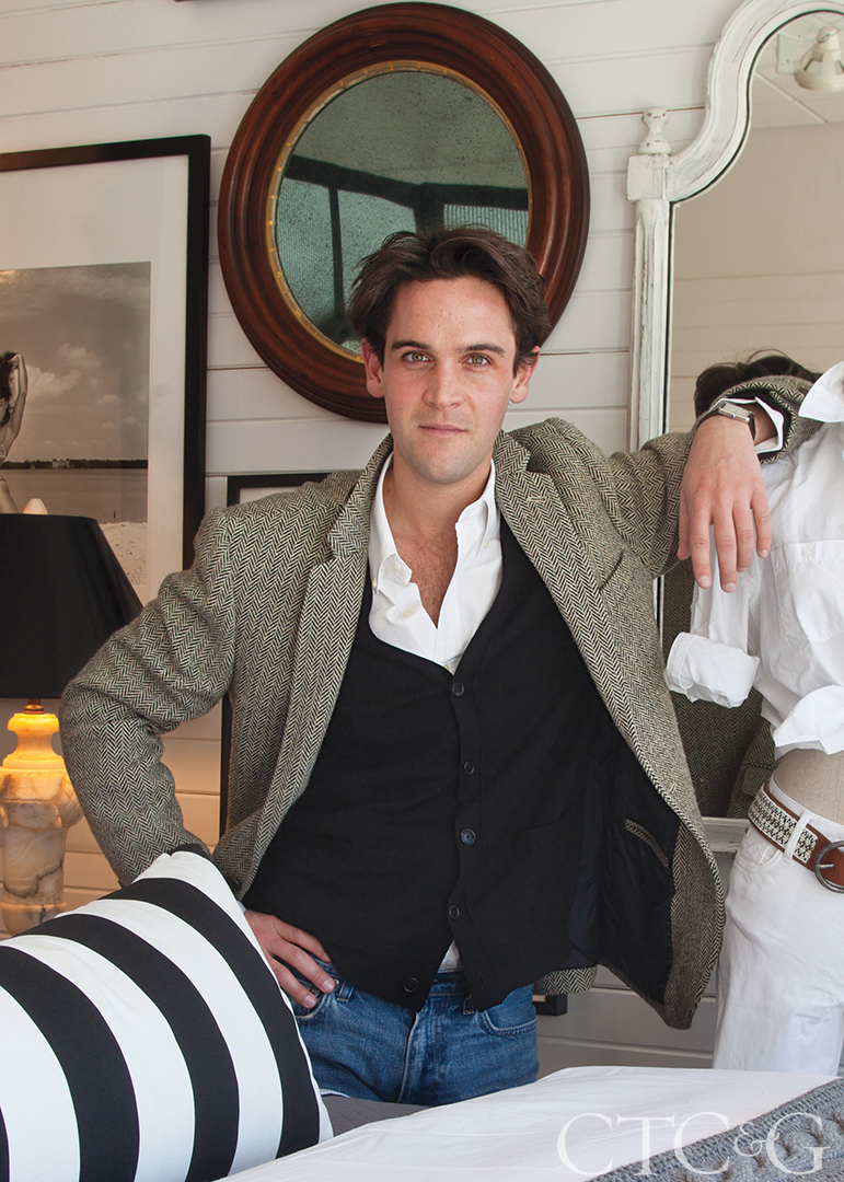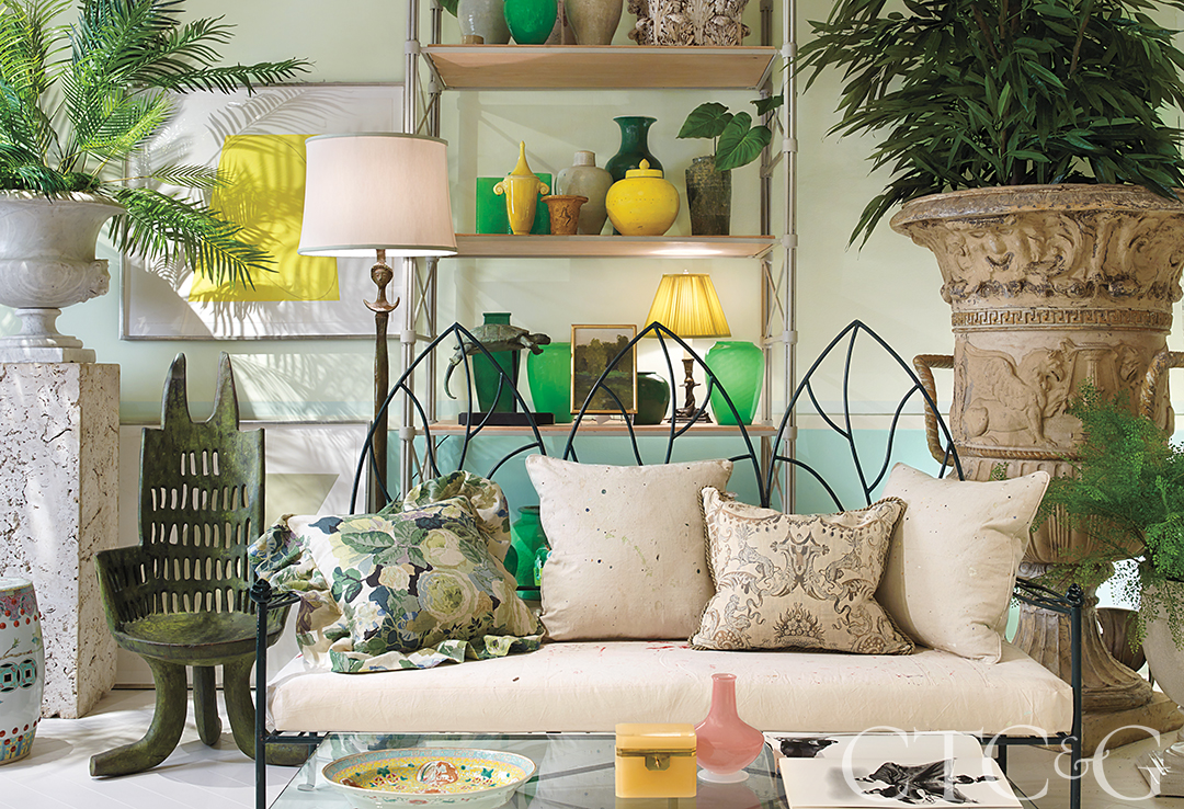 How did the idea for this space come together? Creating the space happened over the course of about 10 days. Because I worked with Ralph Lauren and was in that world for a while, there’s always a story-telling for a room. I imagined an elegant white-washed brick home in Southport, a 1930s mansard-roof home covered with ivy. This would have been the garden room. It’s soft, pretty, Old World. I’m thinking about the music that’s playing in the room. And who’s the woman? I can envision her serving pink lemonade, and she’s a little crusty, maybe throws out a curse every once in a while, but she’s also very genteel.