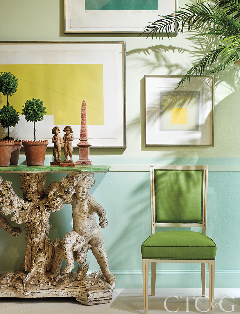 Tell us more about your selections for art and color. I wanted to surround the space with varying tones of greens. I love plant life and used Old School, Old World botanical prints mixed with modern color field work. Then I went around the antiques center and found things in greens and blue shades of greens. The pink makes everything look so good without being preppy—glamorous rather than preppy. Palm trees and uplighting are also glamorous and lend great drama.