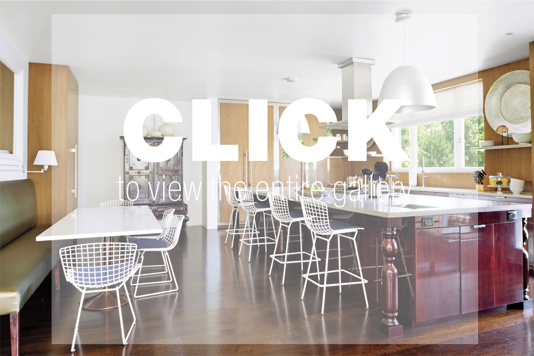 Throughout the house, the combination of disparate objects, repurposed furnishings from a previous home, and custom items keeps you guessing about what’s new and what isn’t. Midcentury-modern Bertoia chairs sharing space with a brass trimmed cabinet from Sri Lanka in the kitchen, and a reupholstered traditional French chair set next to a wood desk with a stainless steel base in the office is all part of the fun.