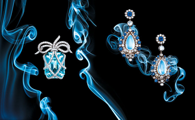 Left: Verdura diamond-wrapped aquamarine brooch mounted in platinum ($55,000). Betteridge, 117 Greenwich Ave., Greenwich, 203-869-0124, betteridge.com, verdura.com.