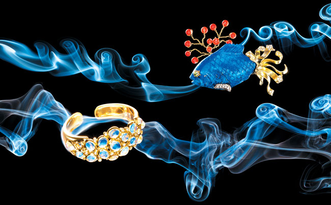 Top: Carved Lapis fish brooch with diamond tail and fins, faceted peridot eye, and coral bubbles mounted in 18K yellow gold ($15,000). Sorab & Roshi, 30 West Putman Ave., Greenwich, 203-869-5800, sorabandroshi.com.