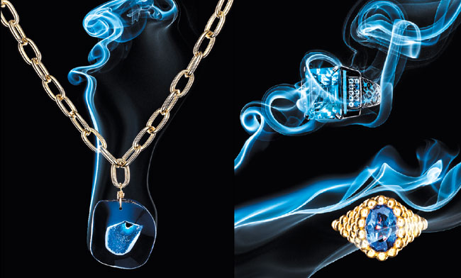Right Top: M.C.L by Matthew Campbell Laurenza enameled sterling silver ring with fancy “Ice Mix” sapphires and blue topaz ( $1,100). Saks Fifth Avenue, 205 Greenwich Ave., Greenwich,203-862-5300, saksfifthavenue.com, mcldesign.net.
