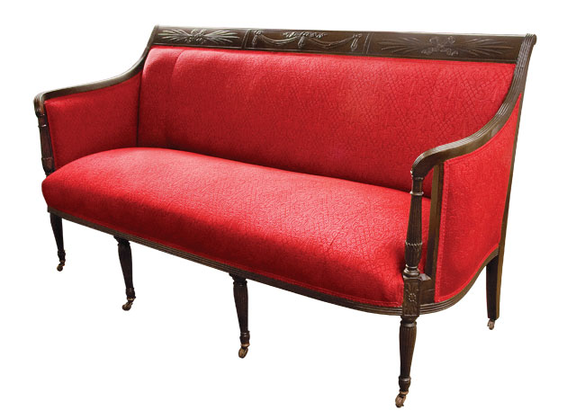 We found two splendid trestle tables offered by Jesse Goldberg at Artemis Antiques in North Salem, NY (22 Wallace Rd., 914-669-5971, artemisantiques.com). And there’s a fine settee attributed to Phyfe in Antiquario Villas and Cottages (antiquariovc.com), the shop of Steve Jablonski and Wilson Forero (1023 Main Street South, Woodbury, 203-263-2211), that is remarkably similar to the example at the Metropolitan Museum. “I’ve always favored Phyfe’s work of the Federal period from 1789 to 1825,” says Jablonski, “and I’m confident that Phyfe himself made this settee. We had it stripped to the horsehair and have done nothing to the piece structurally; some dowels have been replaced over time, which is common for pieces in constant use since the 18th century.”