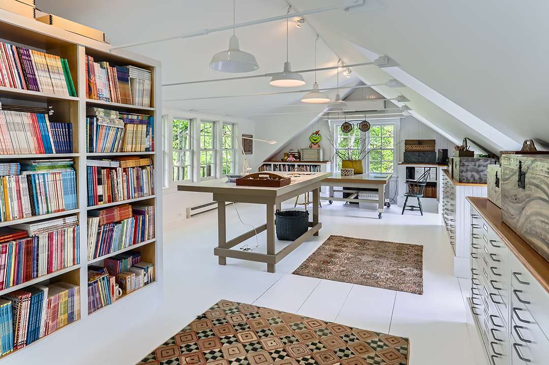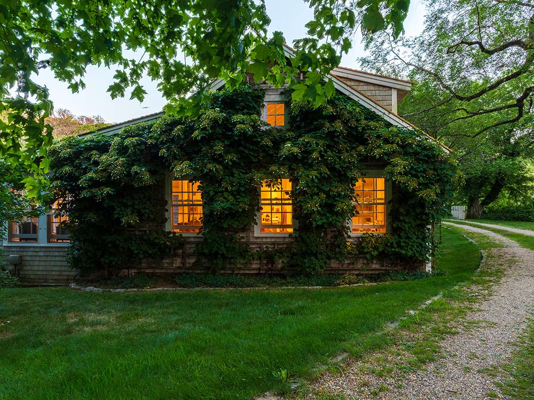 Marc crafted about half the Arthur’s books on the tree-filled property, according to the Wall Street Journal, and it’s no wonder with all the meaningful design details and the calming grounds. The five-bedroom main house, built in 1735 and carefully restored by the sellers, stands as one of the oldest homes on the island. From hand-painted Siberian elm floors and gunstock posts to stone fireplaces and a Dutch door, the spaces are full of cozy character that spark the imagination. Turning the page to the two-bedroom guest house, it features a double-height living room with French doors.