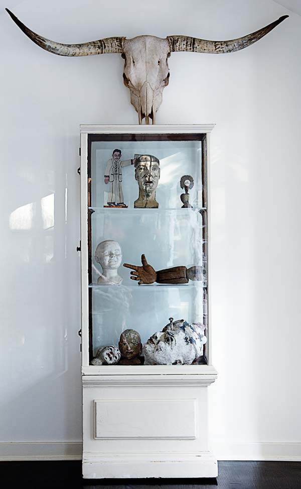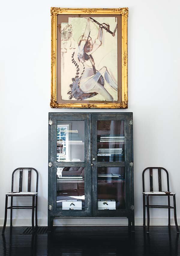 Calm and Collected | Groupings of objects help compartmentalize belongings, for books, photography, and Neleman photography props. The oil painting in the gold frame is by musician Michael Stipe.
